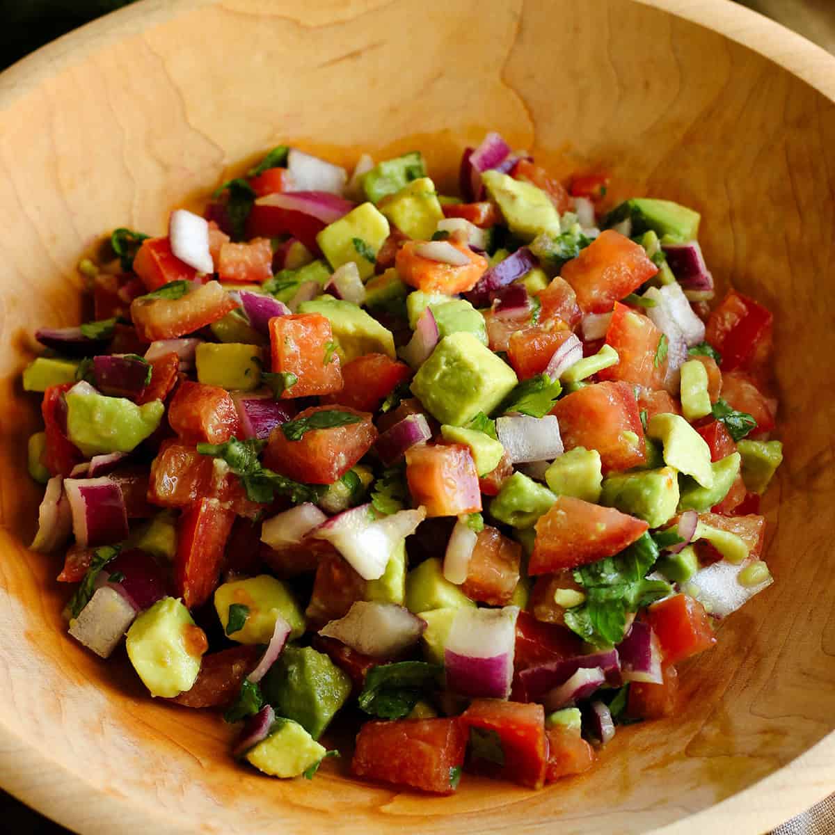 Traditional salsa is made with tomatoes, onion, jalapeños, cilantro, garlic, and lime, while guacamole is mashed and avocado-based. This recipe combines elements of both, using diced avocado and tomatoes for a fresh, spoonable texture. Because of that, it can be served as a salad or a salsa with chips.